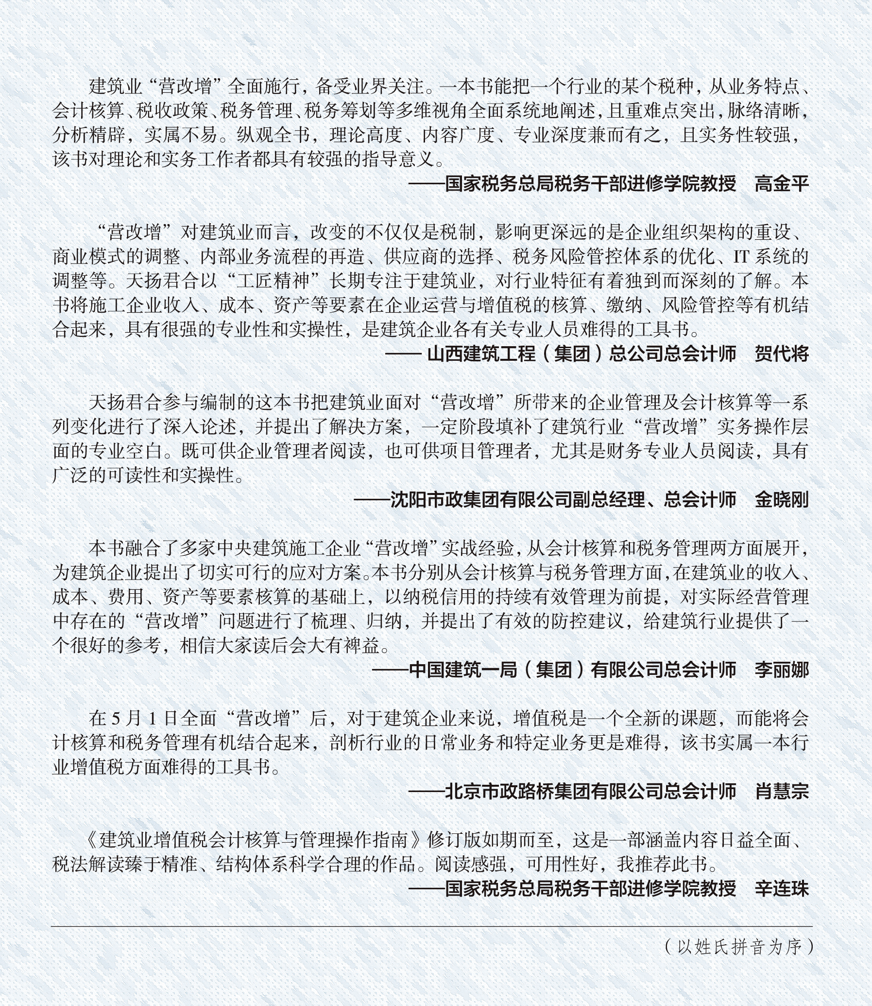 本书由中国财税领域泰斗人物盖地教授主编,汇聚高等财税院校、中国铁建、中国中铁、中国交建、中国核建实战派财税精英、天扬税务专业团队多方智慧编写而成。编写过程中,编写组成员凝心聚力、攻坚克难,根据国家税收法律法规和《企业会计准则》的相关规定,紧密结合建筑施工企业实际情况,充分利用已有研究成果,以体现本书的专业性、实用性和可操作性。